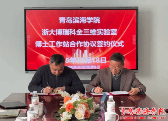 2025年11月18日上午,青岛滨海学院医学院与浙江大学博瑞科全三维实验室共建博士工作站签约仪式在青岛滨海学院大珠山校区隆重举行。浙大博瑞科全三维实验室周晓宾主任、袁也主任助理、吴梦飞项目经理,青岛滨海学院医学院刘成玉院长等共同出席并见证了这一重要时刻长。仪式由副院长张竞竞主持。