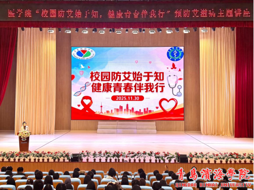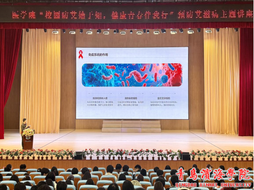 为切实增强学生对艾滋病、猴痘等传染病的防控意识,普及健康知识,2025年11月30日晚19:00,由青岛滨海学院附属医院与青岛滨海学院医学院联合主办的“校园防艾始于知,健康生活伴我行”主题讲座顺利举行。本次活动特邀青岛滨海学院附属医院院长助理鞠桂芳教授、院感科牛同红主任、医务部及公共卫生科郭敏皓医师、亓丰华护师出席,并为同学们授课。医学院学生干事曹大伟主持讲座,医学院2025级全体同学参加。