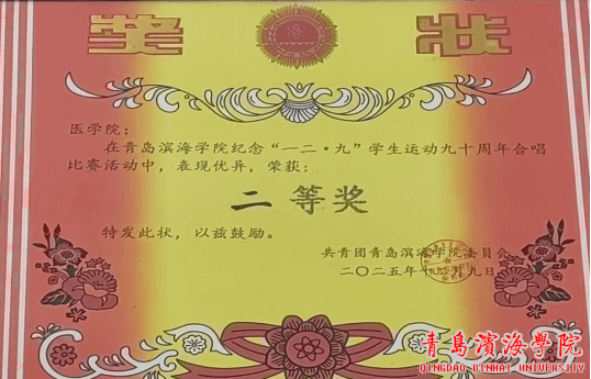 为纪念“一二·九”运动九十周年,弘扬爱国主义精神,我校于2025年12月9日成功举办“一二·九”合唱比赛。医学院积极响应学校号召,组织学生合唱团参赛,凭借《青岛滨海学院校歌》和《我爱你,中国》两首曲目的精彩演绎,最终荣获二等奖。